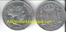The obverse side of this coin shows ISABEL 2a Por La G. De Dios Y la Const.1868 The bust of Isabel 2 is facing right. While the reverse side shows Reina de las Espanas/50/Cs and De Po divided by the coat of arms.
